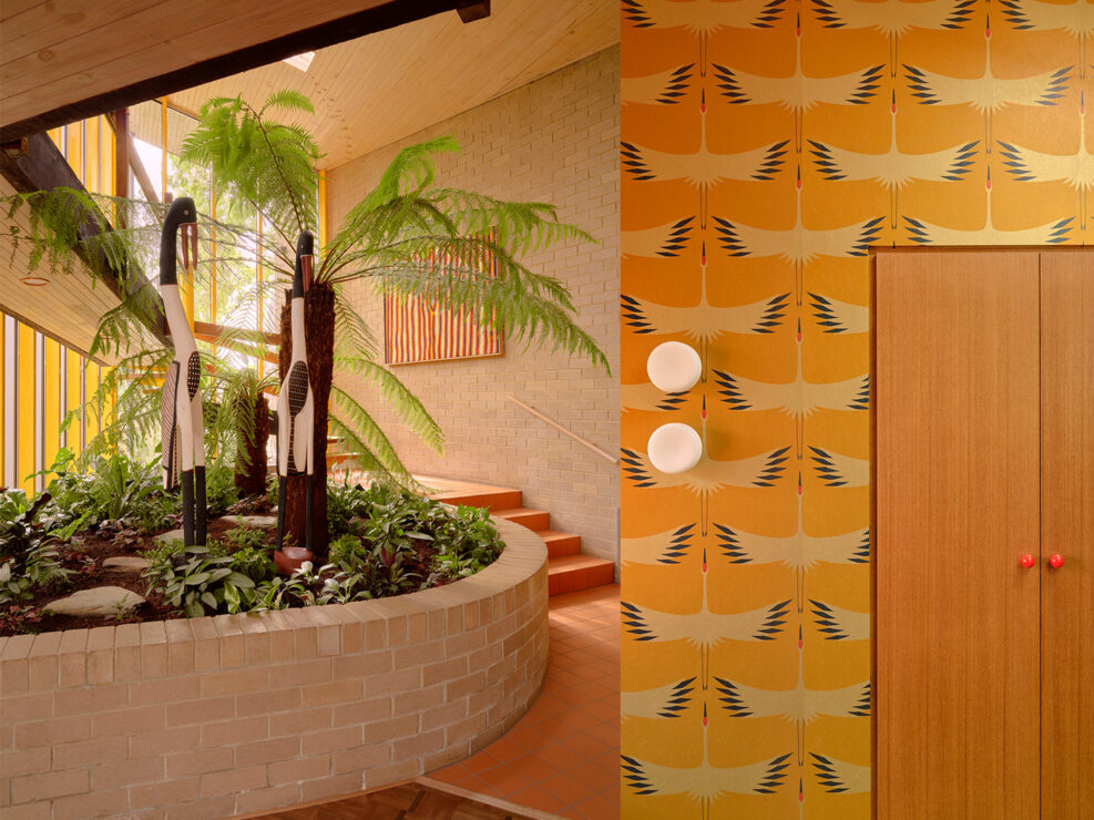 The design centers on the iconic double-height, fern-filled internal garden atrium, shielded by an east-facing slatted shade structure. Acting as custodians, the clients prioritized circularity, opting for painstaking restoration over replacement. This commitment is visible in precise spatial interventions, such as shifting a faceted half-circle window suite 800mm to accommodate an eight-person dining table. A delicious array of colors—primary red, yellow, and Blue—is accompanied by dusty mustard, mission brown, and a gorgeous crane wallpaper, nodding to the Robin Boyd Japanese era that facilitated a uniquely Australian fusion to the Melbourne modernist paradigm.